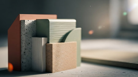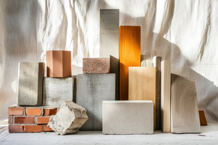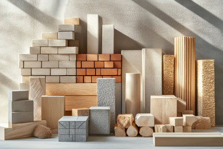 Different construction materials are arranged aesthetically, showcasing bricks, wood, and concrete blocks in natural light with clear space around.