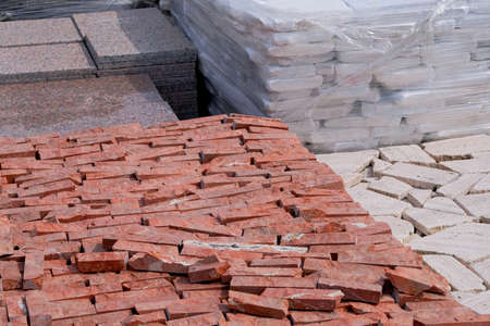 Tiles for decoration and design in construction. Construction Materials. Red stones are sold in construction market.