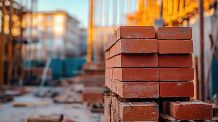 A stack of red bricks neatly arranged on a construction site, with a blurred background of ongoing building work.