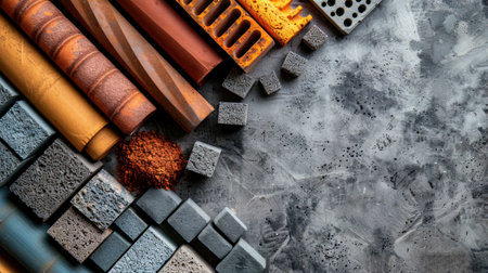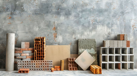 Construction materials, bricks, concrete blocks, building supplies arranged on a weathered gray wall background with an industrial feel and texture, suitable for architectural design concepts