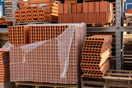 Pallets with stack of redbricks lying at warehouse