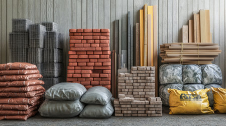 A collection of building materials like stacked bricks, bags of cement, and wooden planks arranged naturally, highlighting the diversity of construction materials