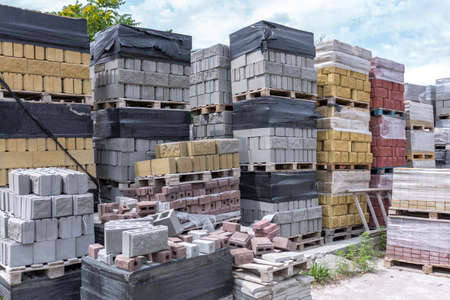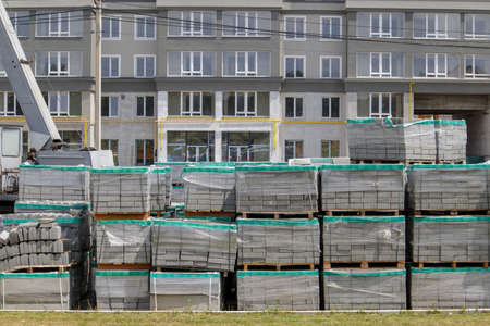 Industrial building cement pressed materials. Concrete block cement brick. Finished products on pallets compactly stacked wooden frame placed on construction site house, rope tape packed open air sky