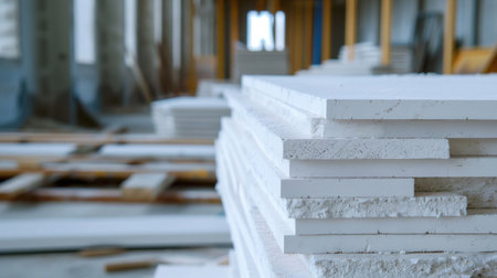A close-up view of stacked white building materials in an unfinished construction site showcases the raw textures and organized piles waiting for installation.