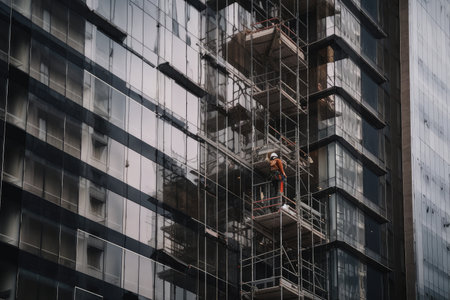 person, working on scaffolding near sleek modern building in city, created with generative ai