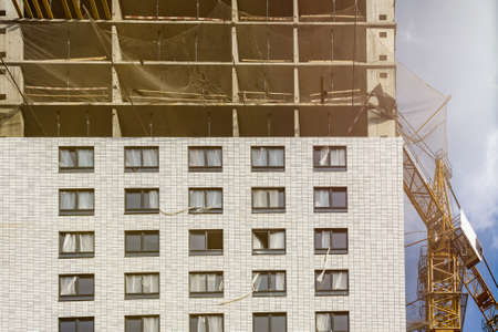 Low angle view of the exterior of a building under construction. An industrial crane can be seen in the background. Horizontal shot.