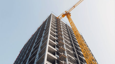 Displaying building skeleton rising at construction site, with tower crane and data overlay panels. Industrial, architecture, engineering, progress, blueprint, urban, technology