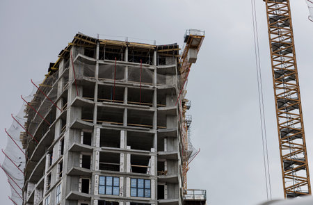 Structural form of a modern G building under construction, raw surfaces and open balconies visible