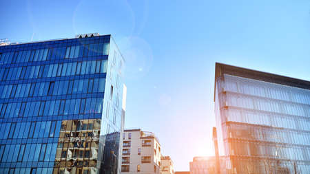 Bottom view of modern skyscrapers in business district against blue sky. Looking up at business buildings in downtown. Rising sun on the horizon.