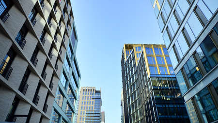Cityscape with modern architecture reflecting the blue sky. Buildings of the business and financial district.