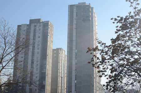 Modern residential buildings with many apartments on foggy morning in early fall