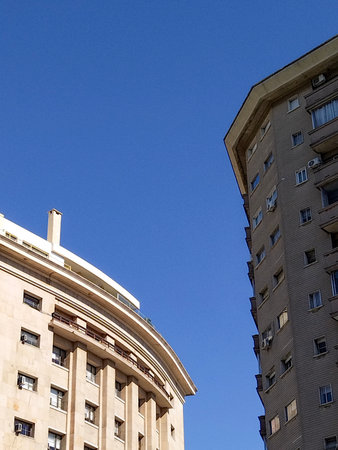 Residential buildings in a quiet neighborhood with high purchasing power, seen from below.