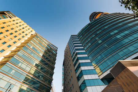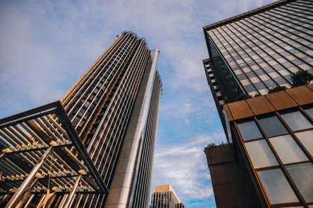 Looking up to skyscrapers and office buildings from below in metropolitan city