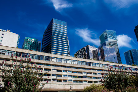Paris, France - September 12, 2022 Cityscape and architecture of La Defense, a business district located in Greater Paris, skyscrapers surround the famous arch in the center of the esplanade