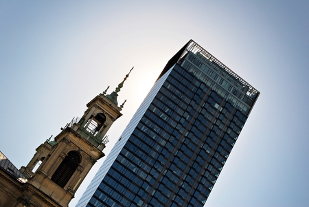tall new steel and glass and old brick and glass office buildings with faded blue sky