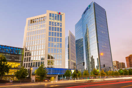 SANTIAGO, CHILE - OCTOBER 16, 2018: Outdoor view of gorgeous financial center buildings district in Las Condes with some plants in the sidewalk