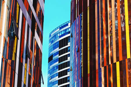 the tops of tall blue glass houses against the pale blue sky. unusual bright fashionable effect. warm color of buildings. blue and white houses of rectangular shape, high columns.