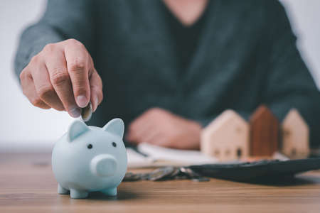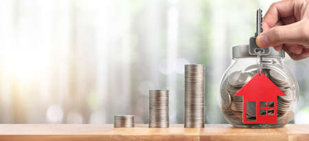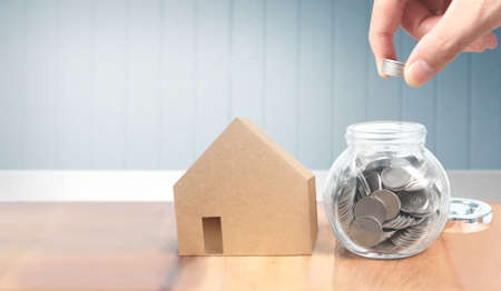 Real estate business investment and finance accounting concept. Hand putting coin into a glass bottle and house model mock-up with money step up growing growth. Saving money for buying a new house.