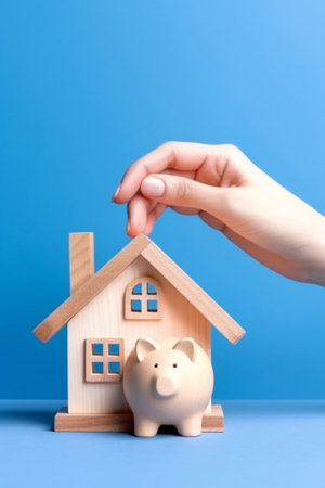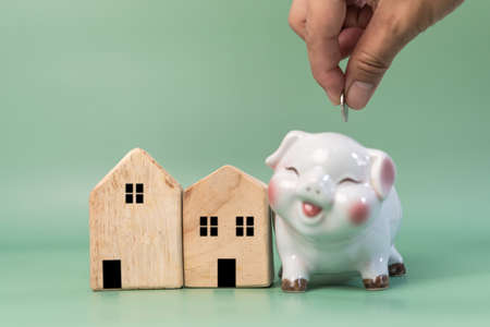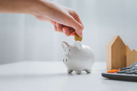 Woman's hand putting coin in piggy bank to save money to buy house.