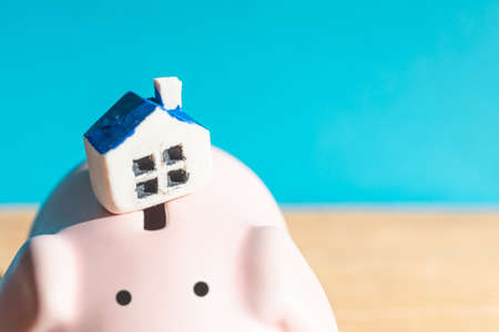 Miniature toy house on the piggy bank blue blurred background closeup selective focus.Copy space.