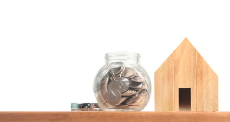 Full coin in a glass jar with house model for show money saving financial concept, home, loan, education in the future isolated on bokeh background.