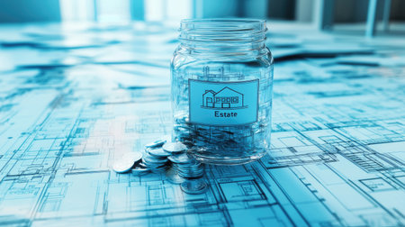 A glass jar labeled estate sits alongside scattered coins on a house blueprint, representing the journey of saving for real estate developments and investments.