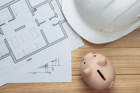 White construction safety helmet and piggy bank with blueprint on wooden boards. Building idea. House building costs. Top view