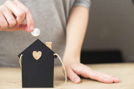 Property investment real estate and house mortgage financial concept. Hand putting money coins in jar with wooden home on table