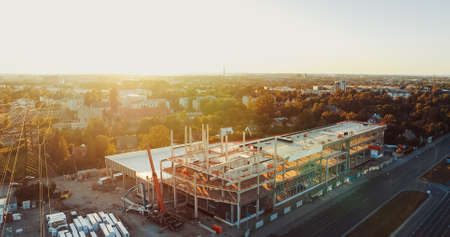 Aerial View of Industrial Commercial Property Building Construction Site. Machinery and Skyscraper Concrete Formwork Frame with in the Sunrise