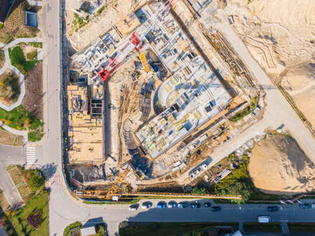 Contstruction Site from above. Aerial view of new apartment under construction. People working. Top view industrial place.