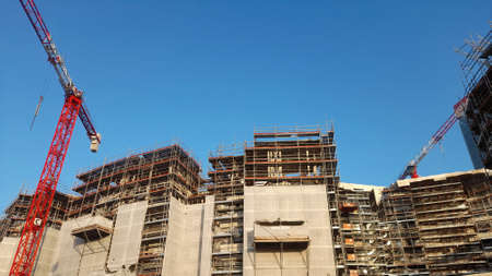 Construction cranes at the construction site against the blue sky. The concept of building a new area. Construction of a new building.