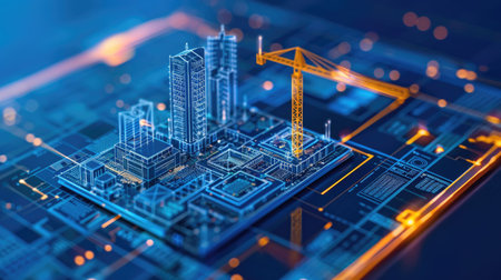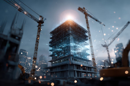 Futuristic Construction Site with Digital Blueprints and Cranes