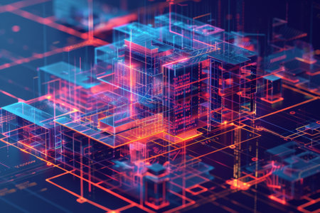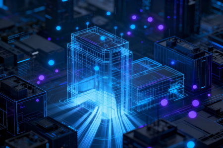 A digital twin model of a modern skyscraper glows with data, visualizing energy consumption and structural integrity in real-time.