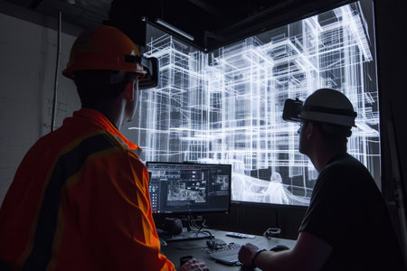 Futuristic construction site with holographic data and ai tools for advanced engineering designs