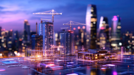 Digital construction site showcasing glowing buildings at dusk with cranes, highlighting innovation and urban development in a bustling city environment