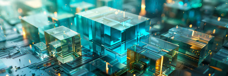 The image showcases a modern cityscape with towering glass buildings, their surfaces reflecting an intricate network of glowing circuit lines. The lines, resembling a digital motherboard, create a mesmerizing and futuristic aesthetic. The perspective is from a low angle, looking up at the buildings and emphasizing the vastness and interconnectedness of the cityscape.