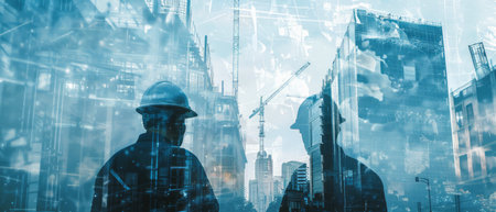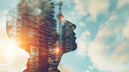 double exposure of a building construction project in a dedicated mind