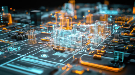 A conceptual visualization of a smart city with glowing structures on a digital circuit board, symbolizing urban technology integration concept. AIG41