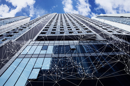 Office glass skyscarpers on the background of blue cloudy sky, IoT, network, data, connection, teamwork, communication concept