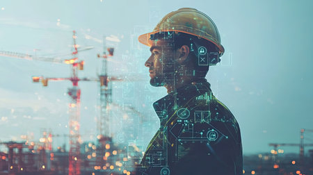Double exposure: Engineer uses digital interface icons with cranes in the background, showcasing tech-driven construction processes.