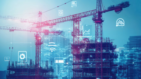 Double exposure of construction cranes and digital tech icons, highlighting tech integration in engineering.