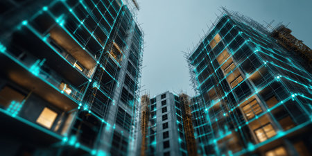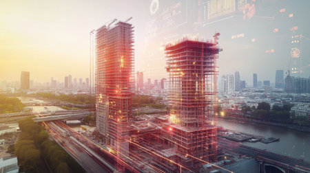 An urban construction site featuring two partially completed buildings with digital technology overlays. The image captures the blend of innovation and traditional building methods, emphasizing modern architectural processes.