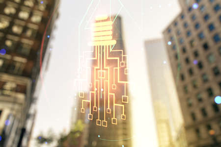 Data theme hologram drawing on city view with skyscrapers background multi exposure. Bigdata concept.