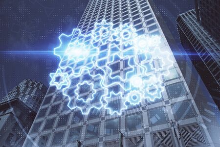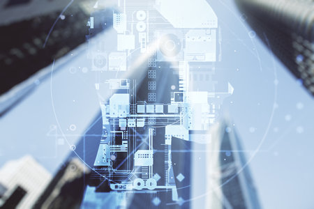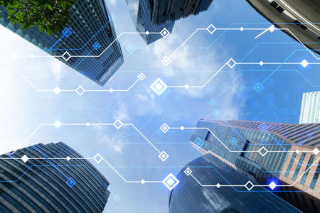 Technology hologram on low, wide angle view of glass and steel contemporary skyscrapers in financial downtown . The concept of developing coding and high-tech science. Double exposure.