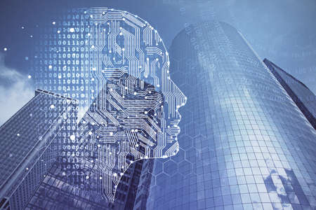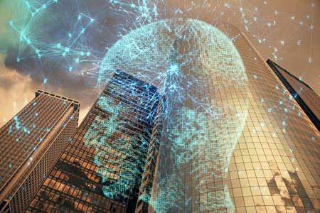 Double exposure of creative artificial Intelligence hologram on modern skyscrapers background. Neural networks and machine learning concept