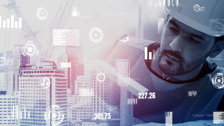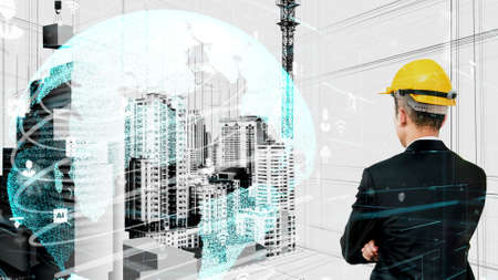 Future building construction and inventive engineering project concept with HUD hologram graphic design. Building engineer, architect people or construction worker works with modern civil technology.