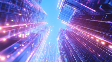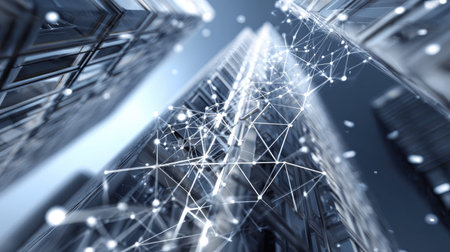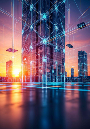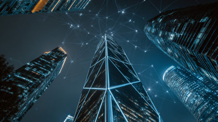 A stunning nighttime view of skyscrapers with a technology network overlay, illustrating the fusion of urban architecture and digital connectivity.