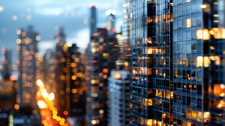 A captivating nighttime cityscape featuring modern skyscrapers with illuminated windows, creating a vibrant glow against a dusk sky, offering a tranquil urban atmosphere.