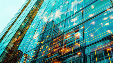 A modern city building with glass windows, reflecting a circuit board pattern. The building is tall and sleek, with a blue glass facade. The circuit board pattern is visible on the windows, and it appears to be glowing. The city skyline is visible in the background.