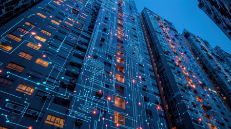 A tall residential building is shown at night, illuminated with glowing blue circuitry lines that resemble a network. The building has many windows, some of which are lit with warm light.
